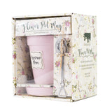 Our Flower Pot Mugs are customer favorites! Mugs come packaged in a cute gift box measuring 6.625" x 7.5" x 4.625" and contain a mug, saucer and spoon. Mugs are 4.625" tall, hold 14 oz. and feature an uplifting message. Coordinating saucer doubles as a lid to keep your drink warm. Stainless steel garden spade spoon is 5.5" x 1.375" and features engraving "A Garden is Made with Love. Dishwasher and microwave safe.
