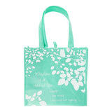 Our Eco Tote reusable shopping bags measure 12.5" x 6" x 12" and feature Scripture verse. Bags fold flat, can hold up to 20 pounds & have a small loop for hanging. Perfect for groceries, Bible study or as an everyday reusable shopping bag. Makes a great gift for the Christian women in your life.