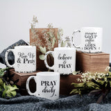 Our ceramic mugs are 4" tall with a 3.25" diameter and hold 12 oz. Microwave and dishwasher safe. Features message believe and pray. Coordinates with other items from our Prayer Program.