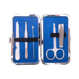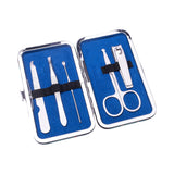 5 stainless steel tools: nail file, tweezers, cuticle tool, nail clippers, and cuticle scissors inside of a custom case