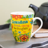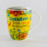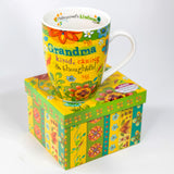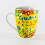 This fun colorful "Grandma" mug gift set makes a great Mother's Day gift or religoius gift for grandma. The outside features a fun quote and the inside features a Scripture verse. Dishwasher and microwave safe. Coordinates with other items from our Hearts 'N Hugs collection.