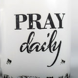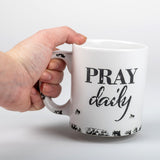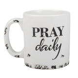 Our ceramic mugs are 4" tall with a 3.25" diameter and hold 12 oz. Microwave and dishwasher safe. Features message pray daily. Coordinates with other items from our Prayer Program.