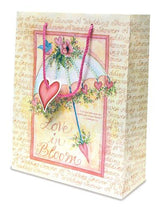 Small Size Gift Bag measures 6.91" x 5. 6" x 2. 8". 3 Free 20" x 26" sheets of coordinating tissue paper with each bag. Matching Gift tags with blank backs to write a special note. Soft, coordinating rope handles. Each bag design includes scripture. Bags sold as 6 packs only. Material: Paper. occasion: Wedding/Anniversary