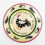 Fused Glass platter measures: 15. 5". Part of the Rooster Collection. Makes a great addition to your table or perfect gift to your love ones. Made from textured glass. Easy to clean. Features Scripture: "This is the day the Lord has made" -Psalm 118:24. Material: Glass.