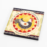 4 Pc. Wooden Coaster Set with Protective Pads. Part of the Rooster Collection. Great gift for any occasion like house warming, weddings, birthdays, Mother's day. Perfect for you Kitchen or Table setting. Features different scriptures in every coaster. Material: Wood.